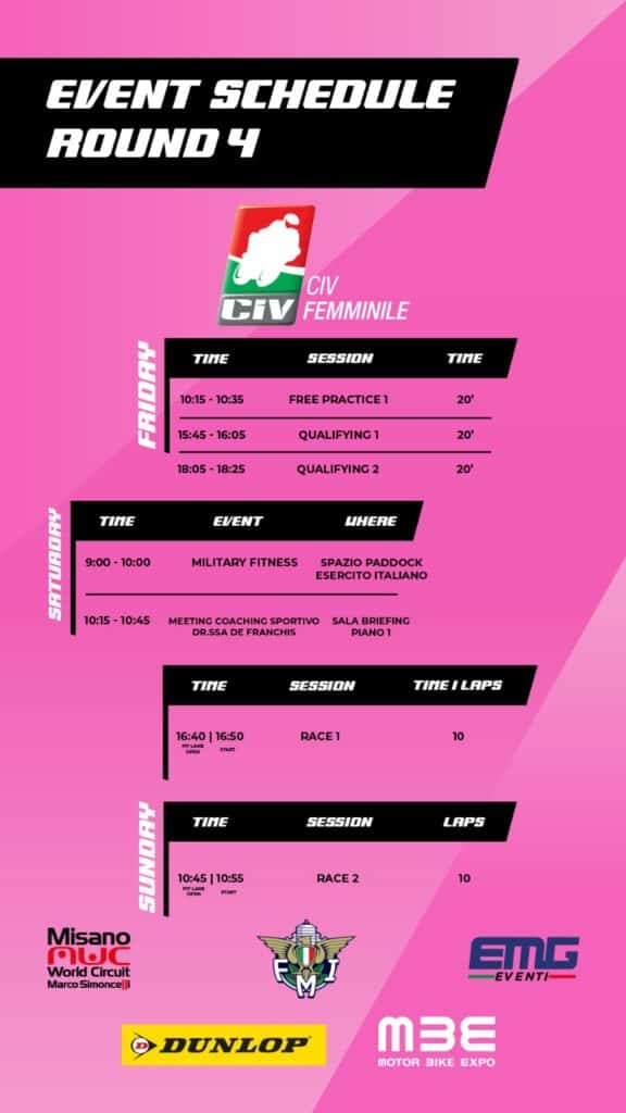 Le pilote tornano sul circuito romagnolo, già teatro del primo round stagionale, dove Martina Guarino ha conquistato la sua prima vittoria e Silvia Comincioli #93 del Team Gradara Corse ha dominato il weekend. Un infortunio in allenamento ha però costretto Comincioli a saltare diversi round, rallentandone la corsa in classifica.