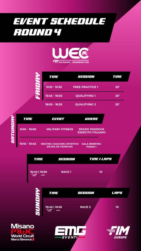 Le ragazze scenderanno in pista venerdì per ben tre volte: un turno di prove libere e le due sessioni di qualifica, per poi concentrarsi su Gara 1 sabato alle 16:40 e Gara 2 domenica alle 10:45.